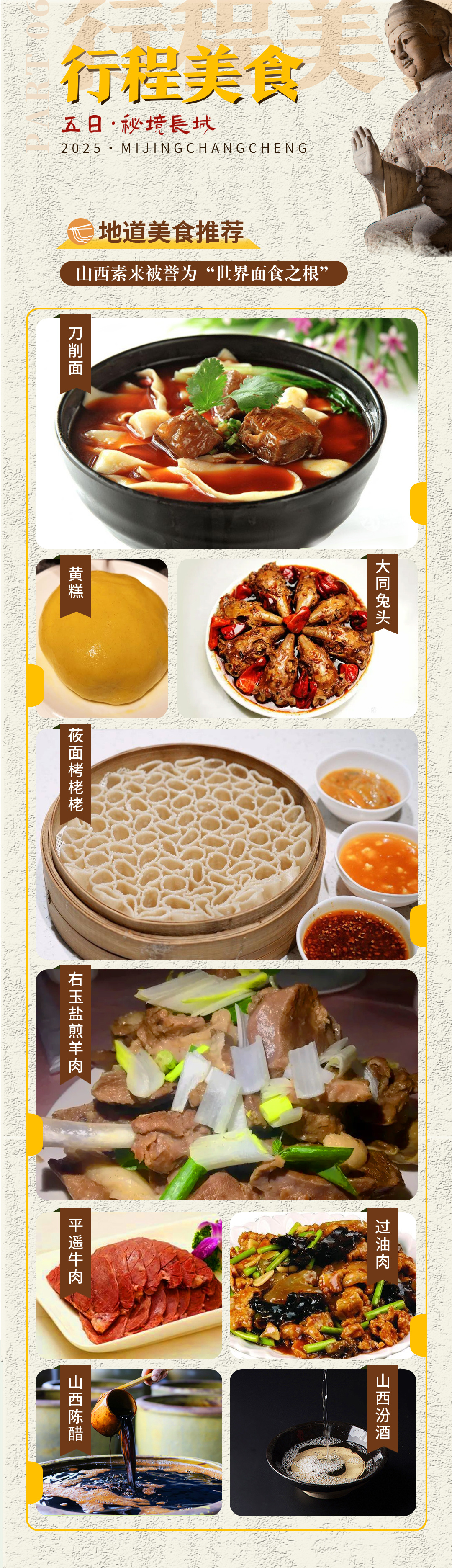 之后乘車前往“中國九大古都之一”的大同。大同在歷史上一直是北方中國的中心城市,素有“三代京華,兩朝重鎮(zhèn)”之稱。時間充裕的小伙伴們,可以在【大同古城】閑庭信步,嘗嘗小吃,品味積淀了上千年的文化底蘊和皇城氣象。