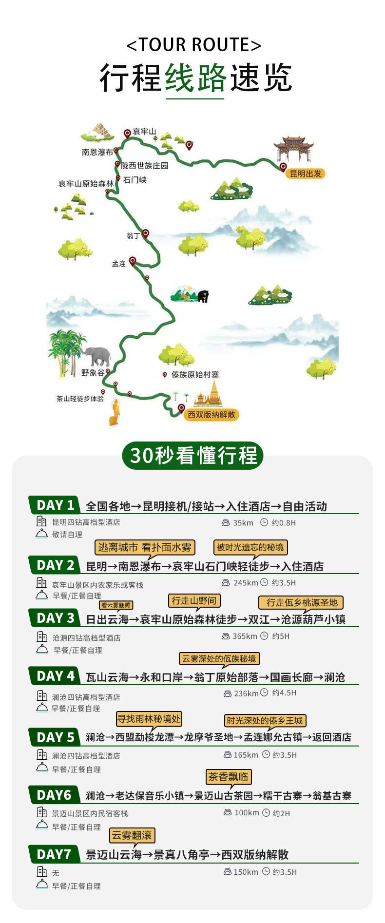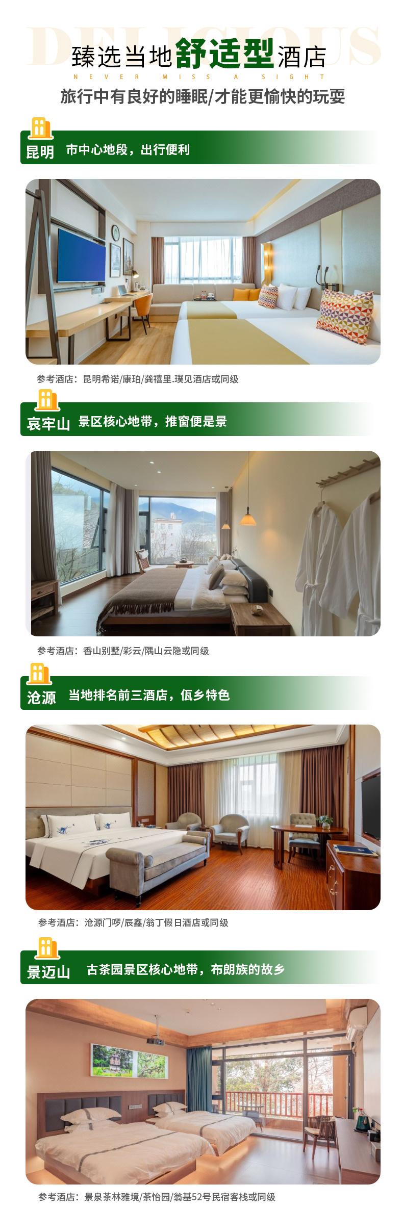 2、住宿:全程6晚優(yōu)選當(dāng)?shù)鼐频辏ɡッ?晚四鉆高檔型酒店,哀牢山景區(qū)內(nèi)1晚舒適民宿客棧,滄源1晚四鉆高檔型酒店,瀾滄2晚四鉆高檔型酒店,景邁山景區(qū)內(nèi)1晚舒適民宿客棧);