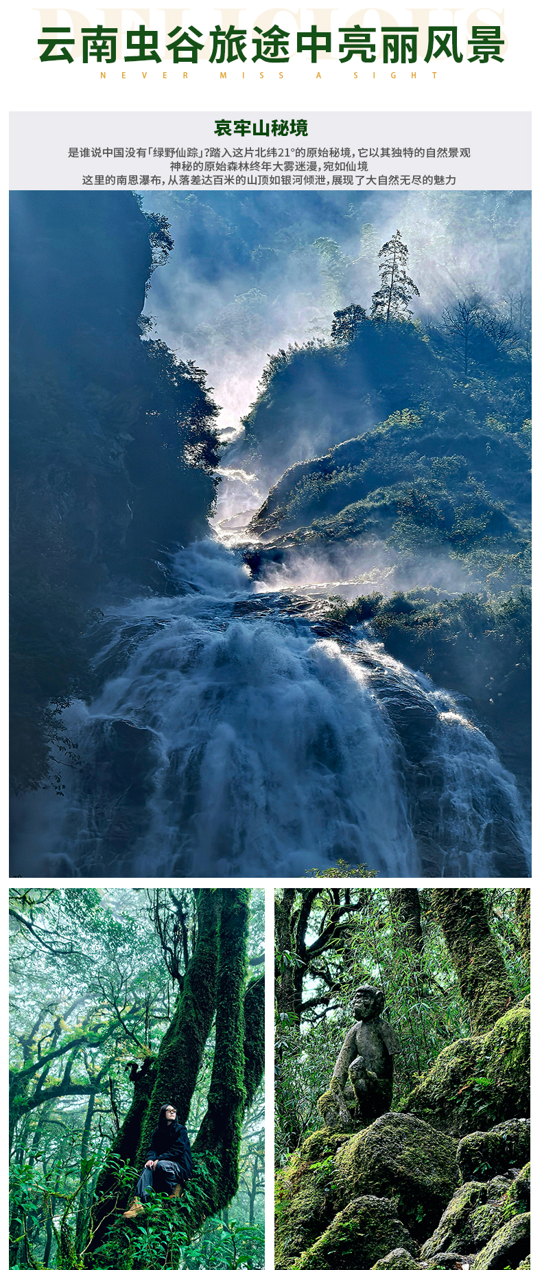 酒店早餐后我們統(tǒng)一前往云南哀牢山秘境,全程高速約4小時抵達哀牢山景區(qū)。一路上您可欣賞沿途的風(fēng)景,感受大自然的魅力。約中午我們抵達新平嘎灑鎮(zhèn)后,可以體驗哀牢山下花腰傣民族小寨子的傣味。午餐后開始進入哀牢山腹地,首先映入眼簾的是【南恩瀑布】高懸于山崖之上,飛流直下,形成一道壯觀的水簾。站在瀑布前,您會被它的氣勢所震撼,仿佛置身于仙境之中。隨后前往參觀【隴西世族莊園】,在這里,解密古代哀牢國的興衰歷史以及土司制度的歷史縮影,了解關(guān)于云南邊陲小鎮(zhèn)的部分歷史記載;隨后我們將前往【石門峽】。這里峽谷幽深,兩側(cè)峭壁聳立,中間一條清澈的小溪蜿蜒流淌。沿著小溪前行,您會感受到一種寧靜,又因其自然的景色酷似九寨溝,被游客稱為“哀牢山上的九寨溝”。