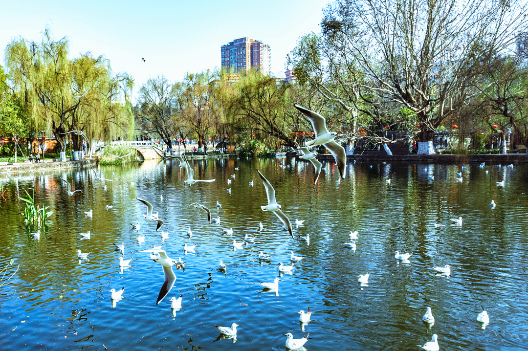4、滇池海埂大壩,觀景長廊,以開闊的湖景、壯觀的紅嘴鷗群和西山“睡美人”山景聞名,每年11月至次年3月,是最佳觀海鷗勝地。