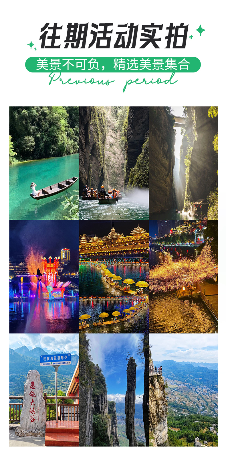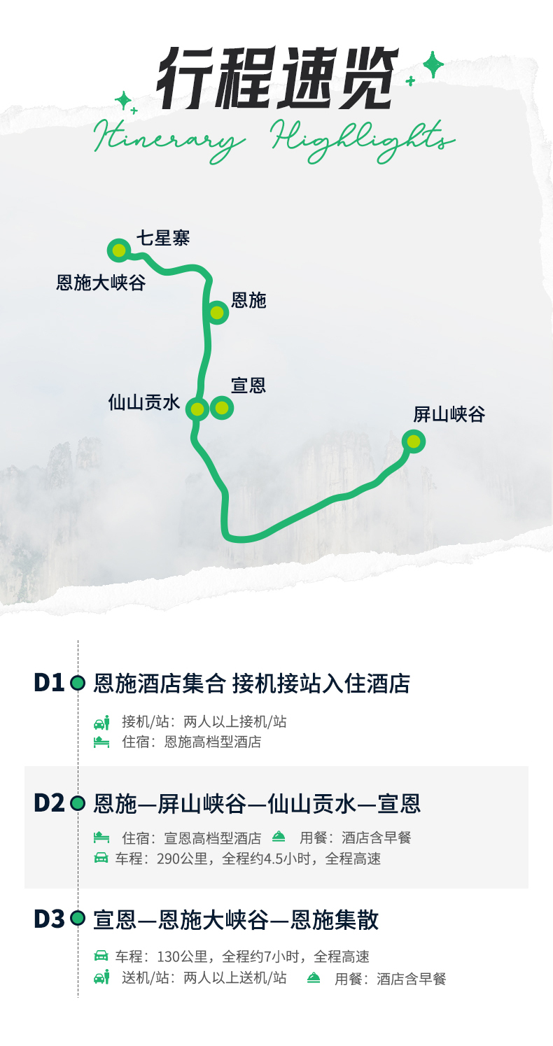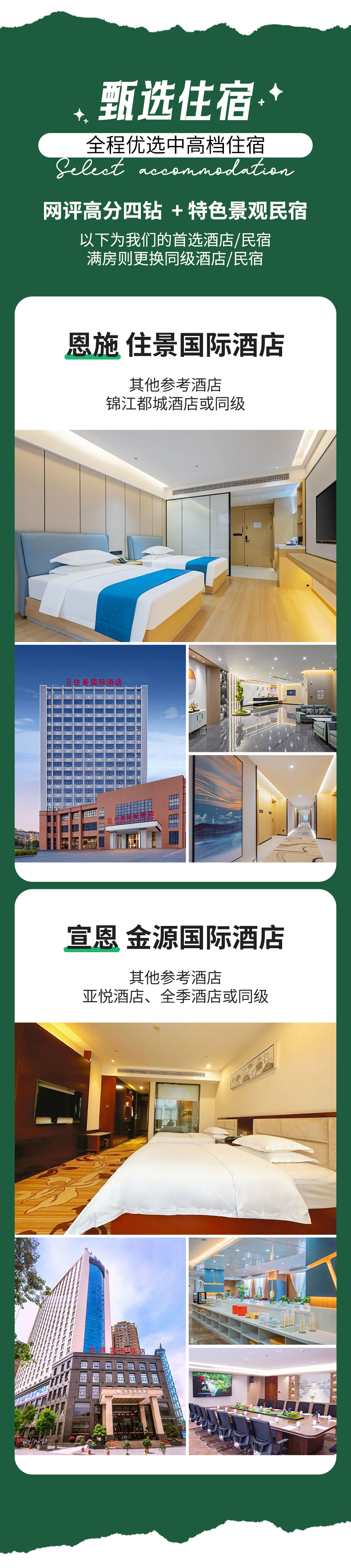 領(lǐng)隊(duì)會(huì)將大家送到恩施機(jī)場(chǎng)和恩施火車站。大概17:30/18:00到達(dá),建議定18:00及之后的機(jī)票和火車票。(節(jié)假日排期預(yù)計(jì)延后1小時(shí)),以免耽誤行程。如預(yù)定次日大交通返程,可提供代訂住宿服務(wù)。