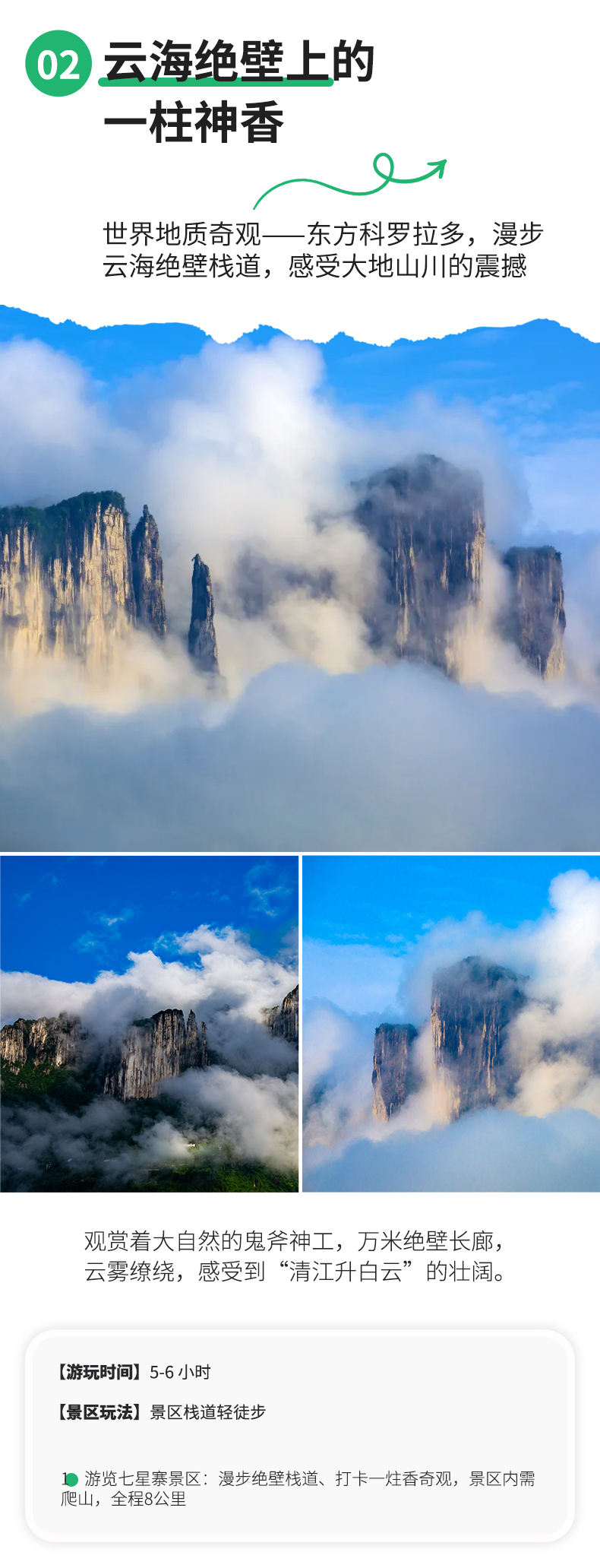 這里是世界地質(zhì)奇觀、喀斯特地形地貌博物館,峽谷中有百里絕壁、千丈瀑布、原始森林、 遠(yuǎn)古村寨等。在這里一邊觀賞著大自然的云霧繚繞,一邊感受到“清江升白云”的壯闊。然后我們將前往「七星寨」,隨著海拔的升高,眼前美景不斷變化,驚嘆大自然的鬼斧神工。
