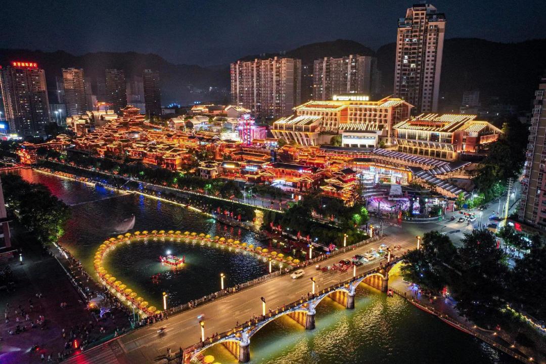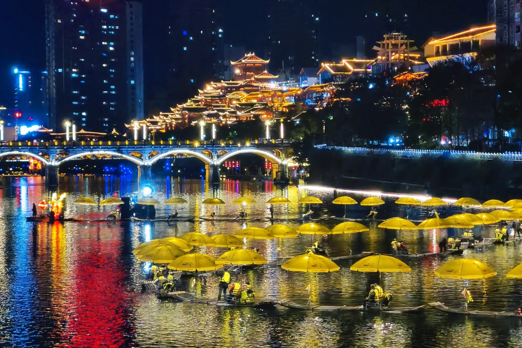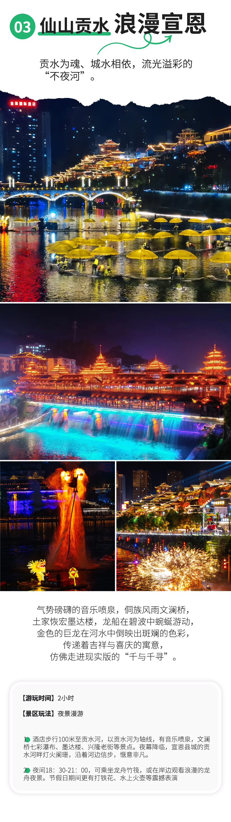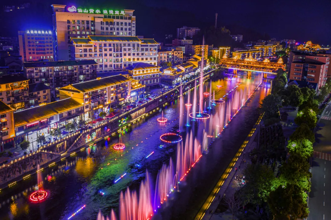 在宣恩這個(gè)浪漫小城,一河兩岸,燈光璀璨,半城煙火半城仙。國(guó)內(nèi)最長(zhǎng)的音樂跑泉在此歡快跳躍,宛如仙女的絲帶在空中舞動(dòng)。晚上可以去體驗(yàn)特色宣恩烤活魚,再漫步貢水河畔,走上風(fēng)雨文瀾橋,感受恩施小洪崖洞浪漫夜景。