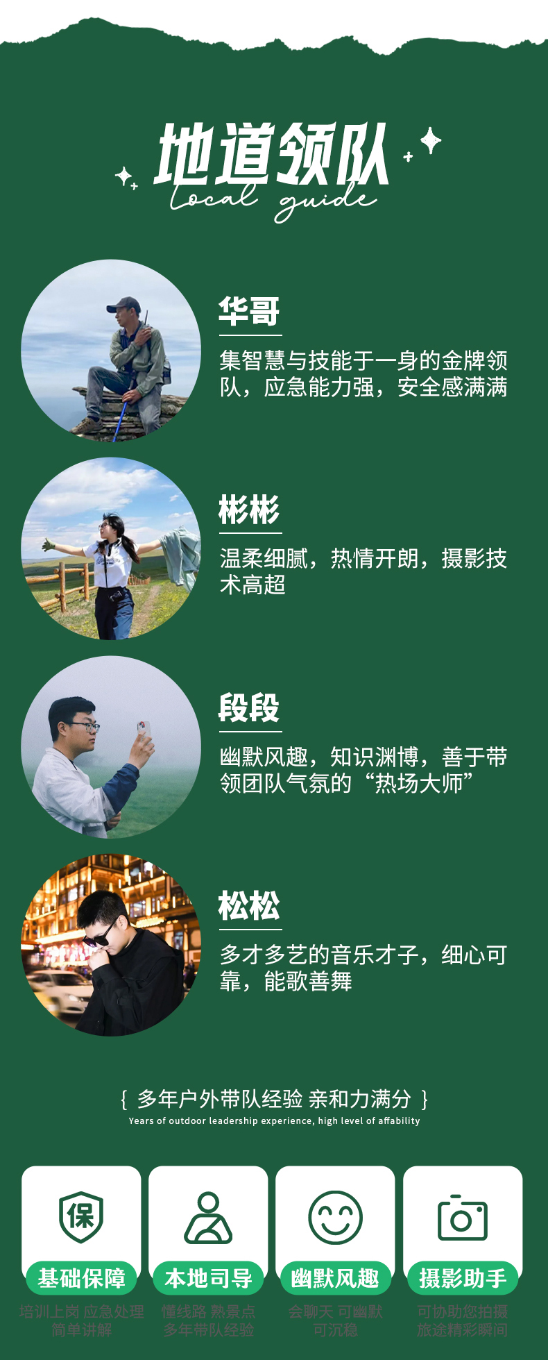 (3)此線路適合5-65周歲旅游者(身體健康,腿腳便利,非大中型手術(shù)的恢復(fù)期病患者,無(wú)傳染性疾病、無(wú)精神疾病或無(wú)嚴(yán)重貧血、無(wú)突發(fā)性疾病等的戶外自然愛好者)報(bào)名參加,孕婦不接待;代他人報(bào)名者也請(qǐng)核實(shí)代報(bào)人的身體狀況。如果報(bào)名者或者代他人報(bào)名者隱瞞身體狀況,造成的后果,由自己承擔(dān);
