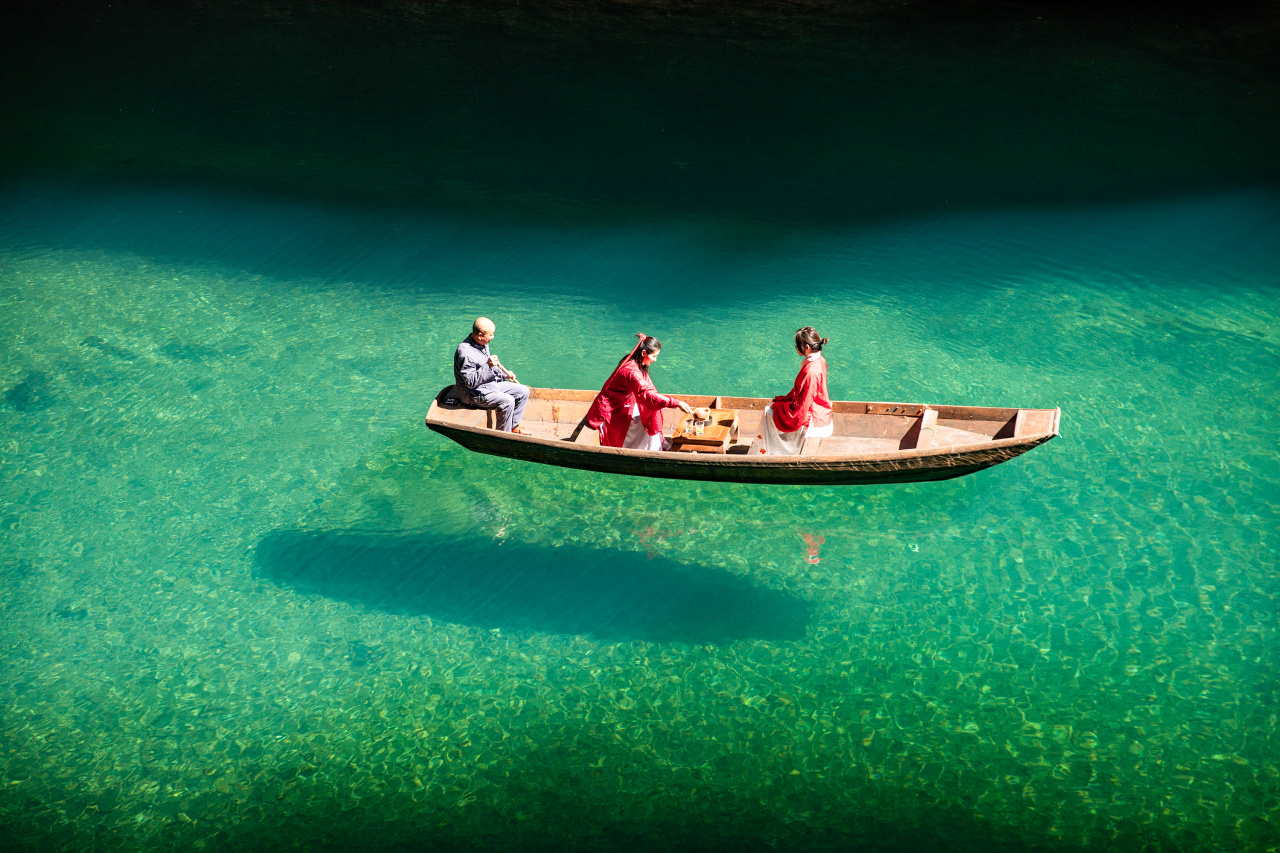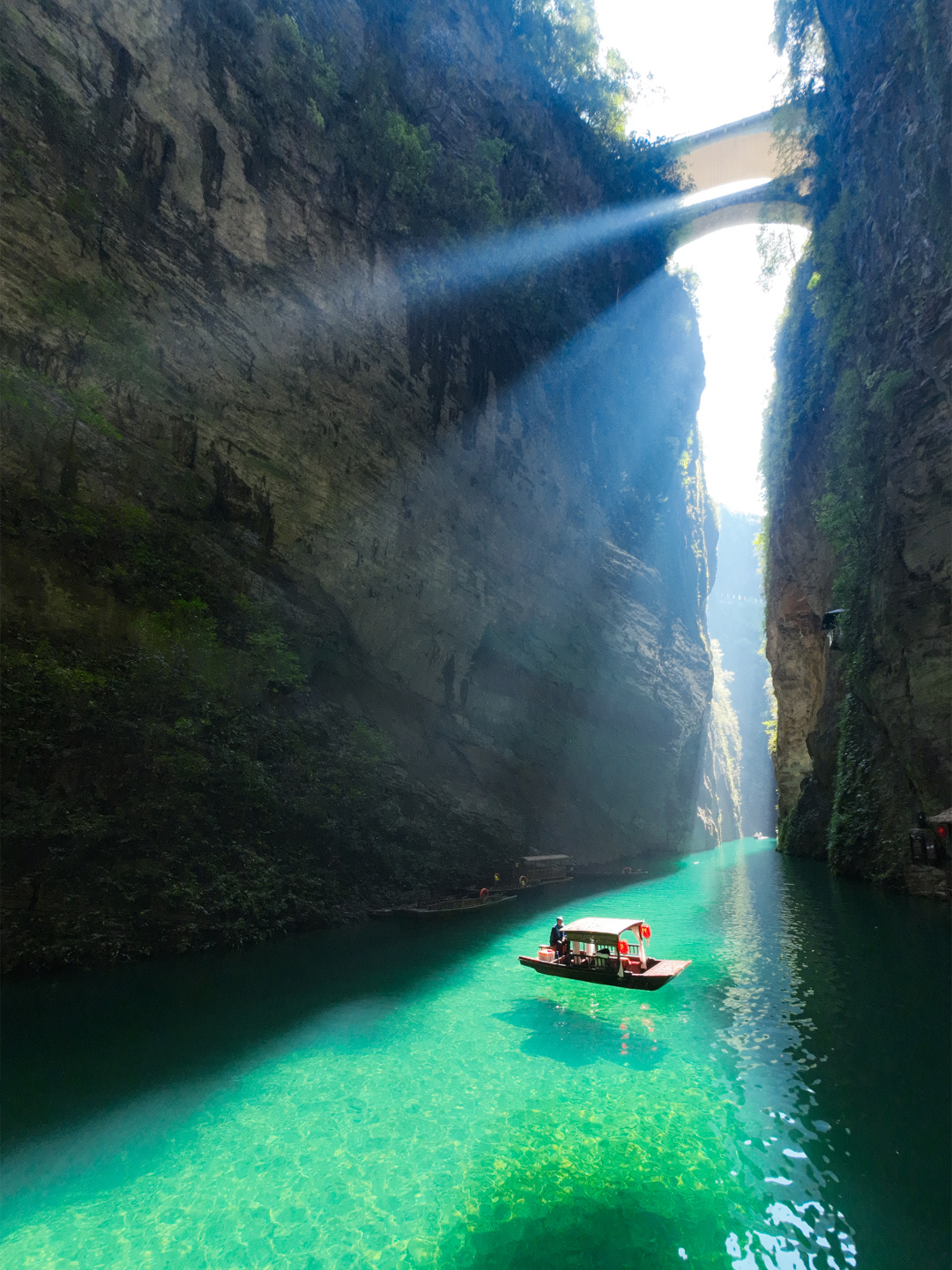 沿著景區(qū)步道下到峽谷河邊,欣賞沿途的風(fēng)景,角度不同,欣賞到的風(fēng)景也不盡相同。峽谷深達(dá)百余丈,溪水碧藍(lán)清澈見底。如遇晴天,陽(yáng)光折射入水面,行舟于上宛如懸浮在空中一般;如遇雨天,峽谷之中因?yàn)闇夭钋闆r, 會(huì)行程一層層薄薄的霧氣,煙霧繚繞,如遇仙境。