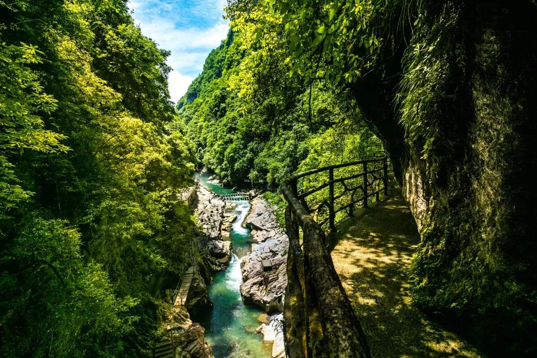 沿著依山而開的棧道前行,或穿行于蜿蜒的石階小路之間,面前一座座山峰層層疊疊,或龐大穩(wěn)重,屹立不倒;或壁如刀削,直聳云端。在這一段峽谷里旅行,伸手可及石壁,石壁上的連綿青苔,碧綠柔軟;棧道下的河水,浪花雪白;回水潭里的瑩瑩碧水,澄澈明凈。