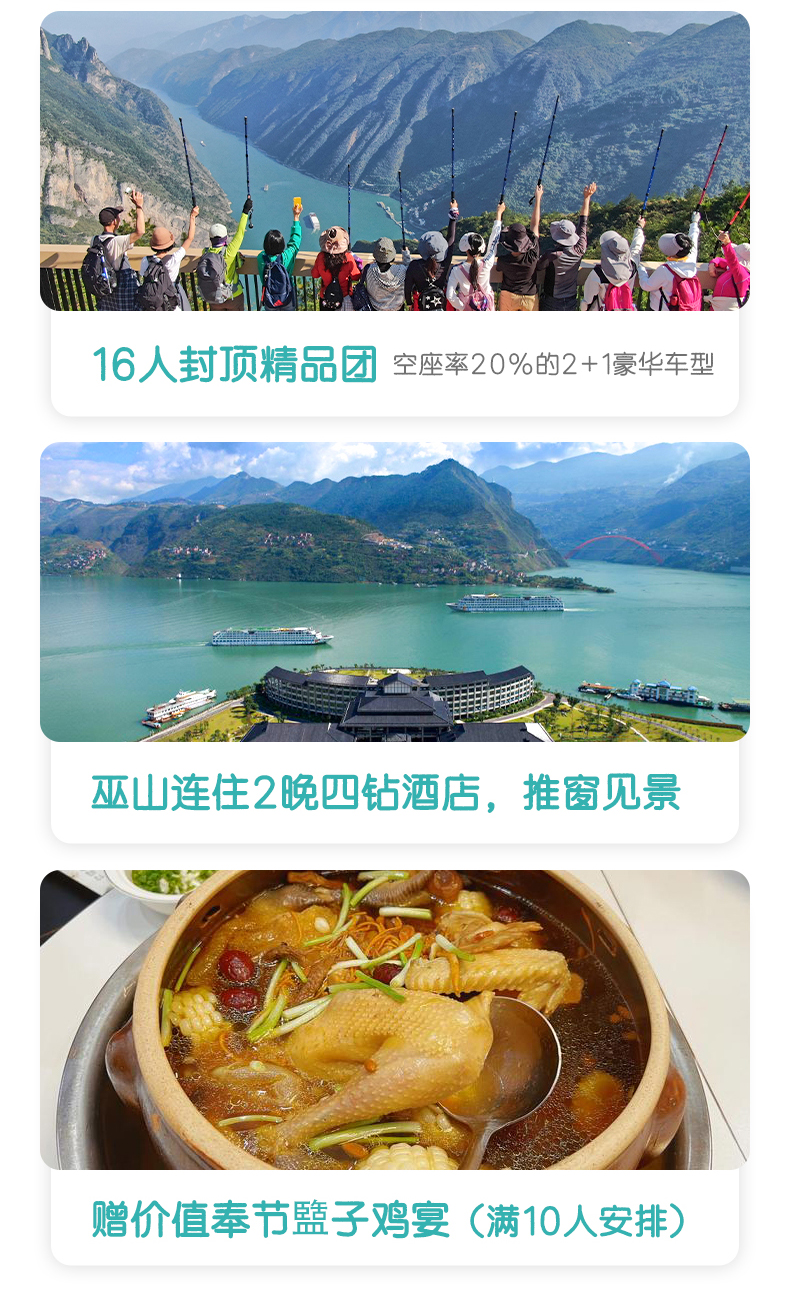 4. 用餐:全程含酒店早餐;滿10人贈送奉節(jié)盬子雞特色餐;