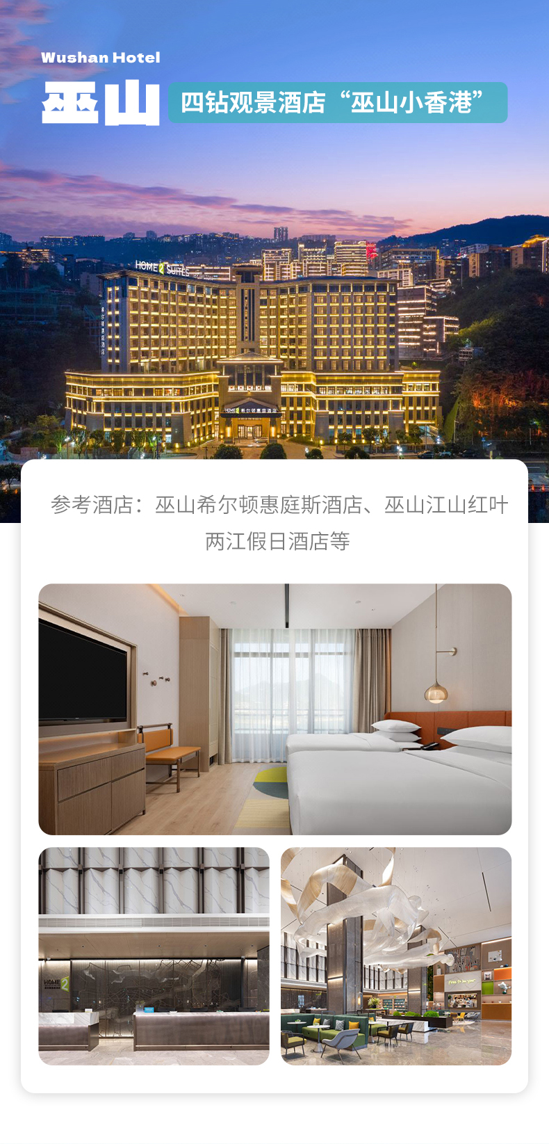 2. 住宿:宜昌江景四鉆酒店住宿1晚(參考怡景美季酒店、宜景美怡酒店、麗橙酒店等)、巫山高端四鉆酒店住宿2晚(參考希爾頓惠庭酒店、溫德姆酒店、江山紅葉酒店等);