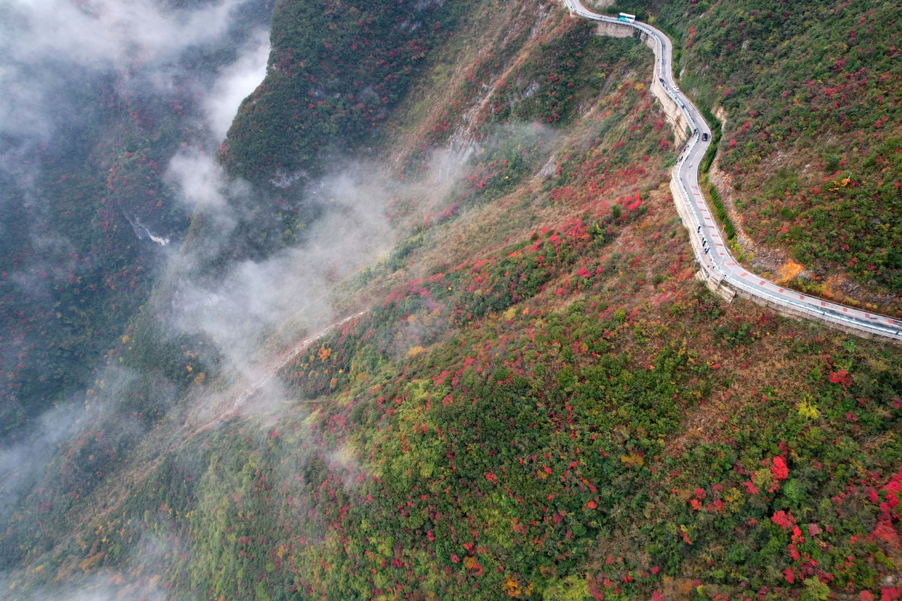 后面我們乘坐黃巖索道下到谷中央,這里的棧道旁,都是連片紅葉,遠處群山時隱時現(xiàn)。