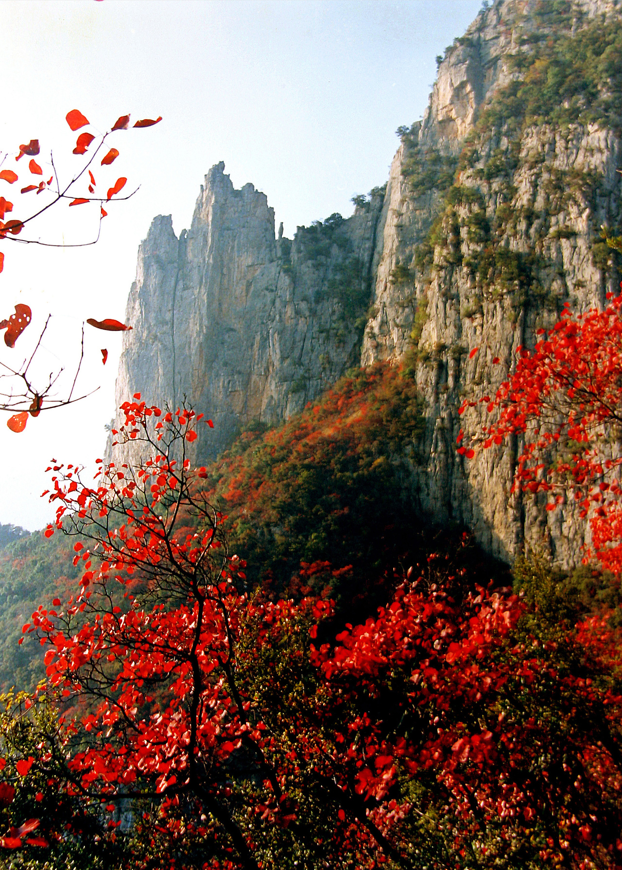 文峰觀紅葉隨著山脊線分布,形態(tài)秀美。山脊上高大挺拔的黃櫨紅葉燃燒似火,怪石林立夾雜其間,置身其中與之零距離接觸,何等暢快愜意。