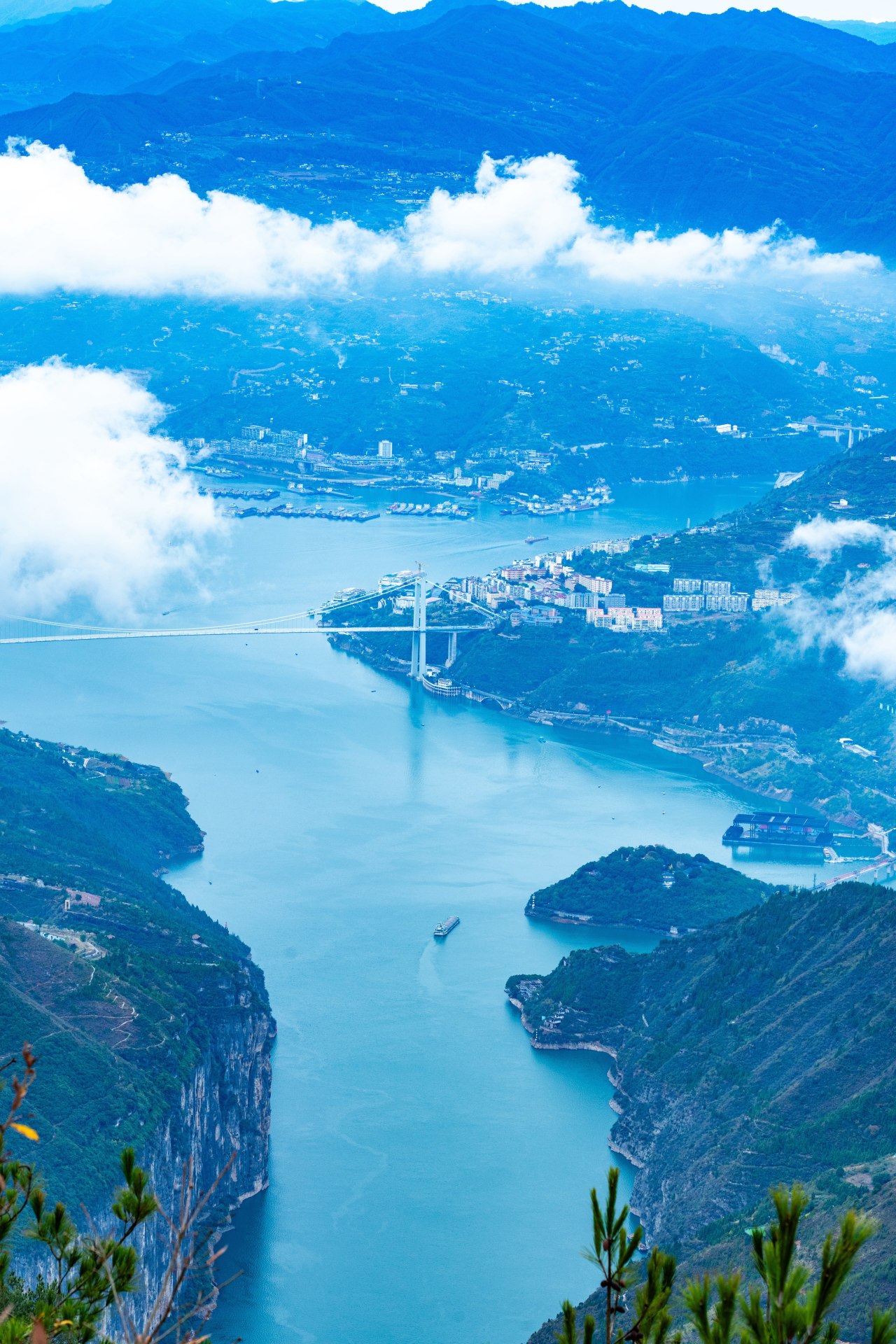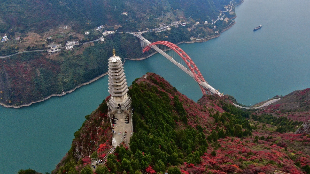 站在文峰觀山頂遠眺,紅葉遍山巒,長江如帶、柔潤綿長,一江碧水與江山紅葉交相輝映,蔚為壯觀。透過似火的紅葉,俯瞰巫峽口彩虹臥波,“一橋飛架南北,天塹變通途”。遠眺巫山縣城依山層疊,江與城風情如畫,讓人頓生江山豪情。