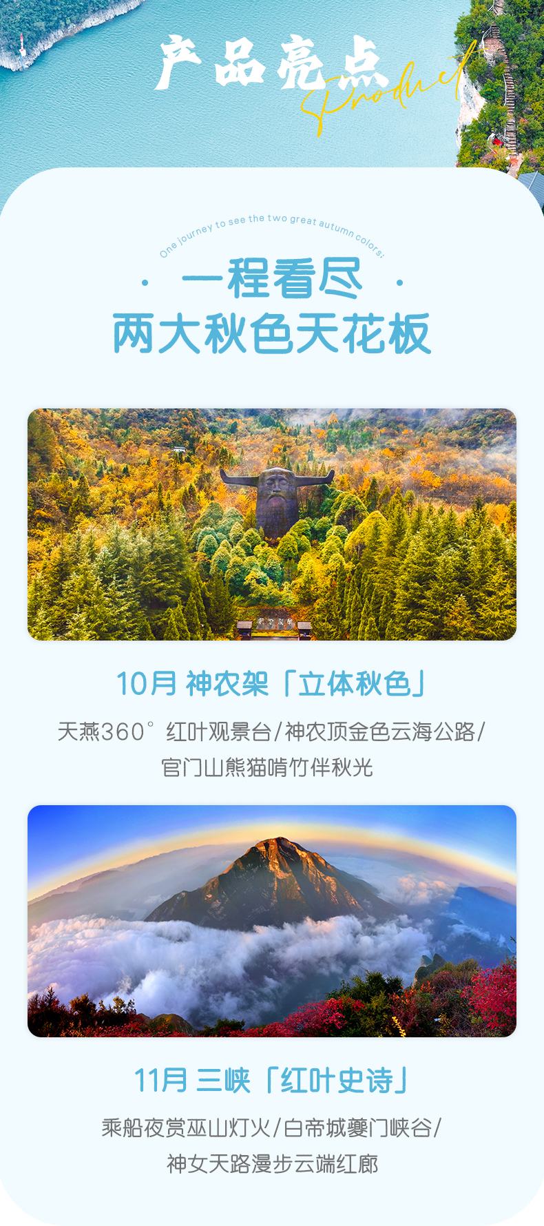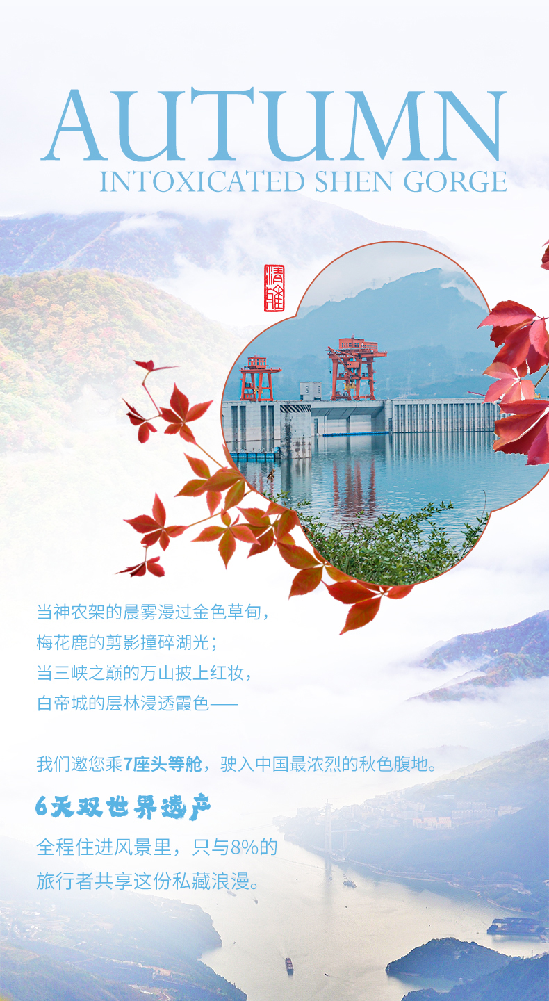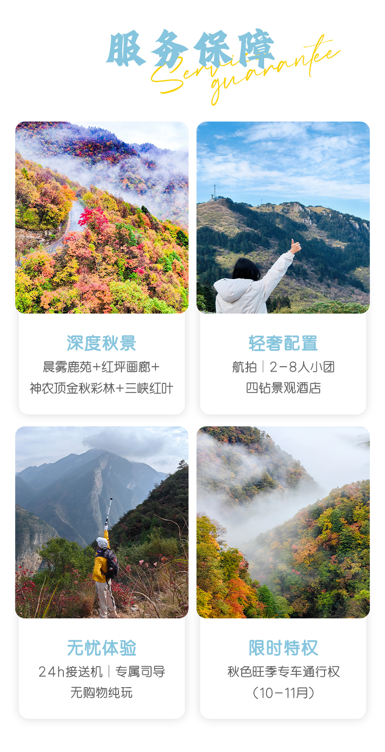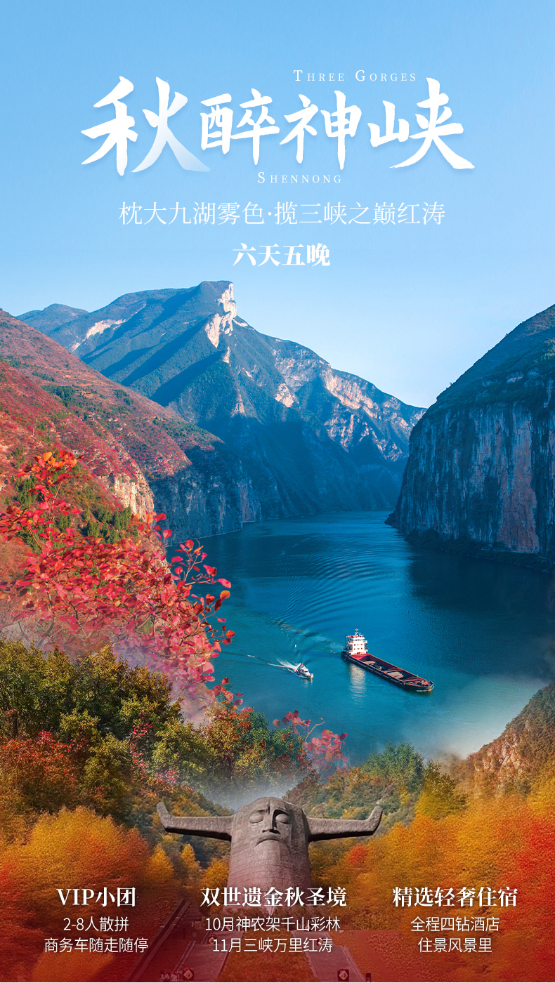 3. 本產(chǎn)品屬于秋季產(chǎn)品,秋景確定時間不確定的,正常是10月份神農(nóng)架秋景、11月三峽秋景,但是也有提前或延后情況,游玩時請合理對待實際景色;