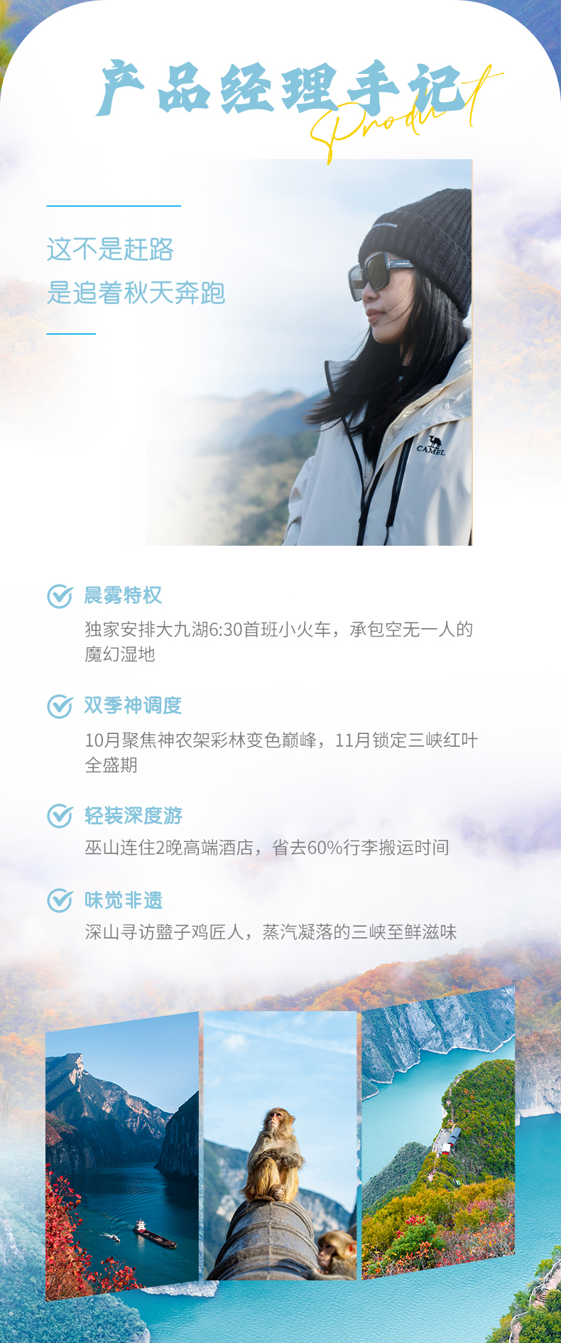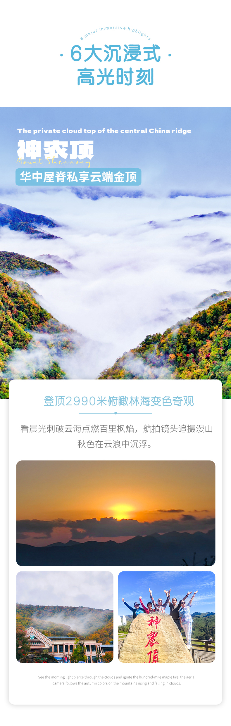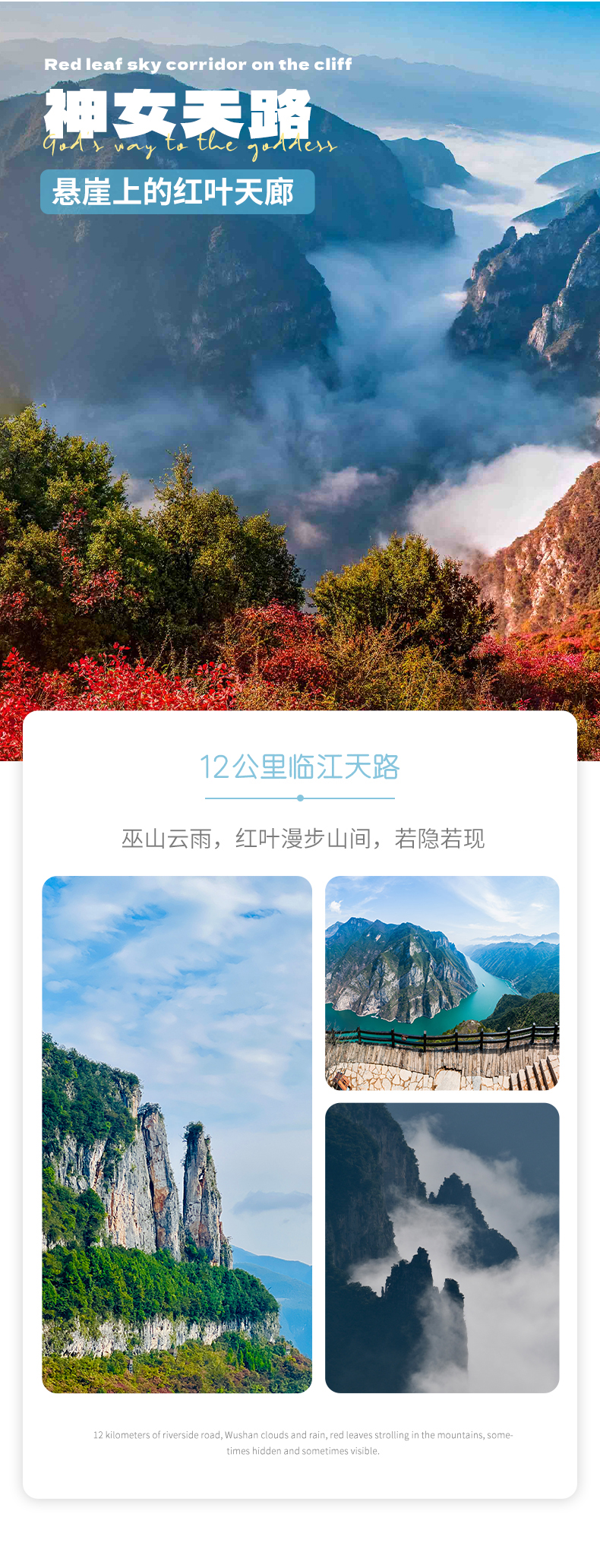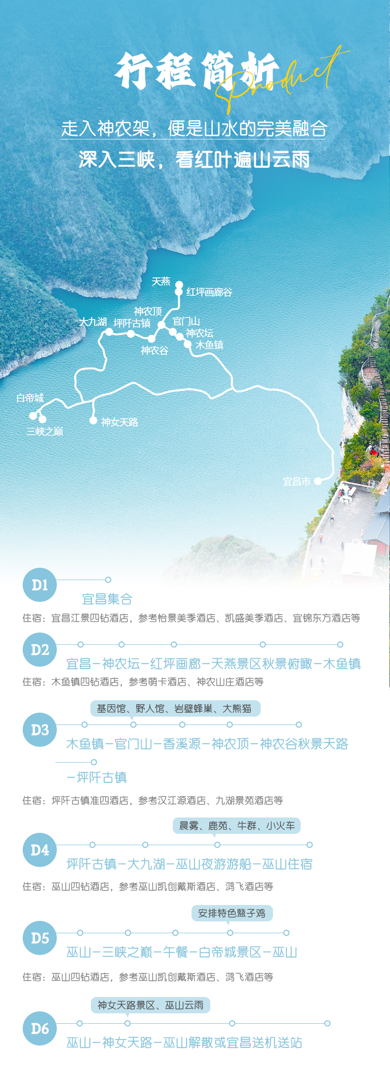 3. 本產(chǎn)品屬于秋季產(chǎn)品,秋景確定時間不確定的,正常是10月份神農(nóng)架秋景、11月三峽秋景,但是也有提前或延后情況,游玩時請合理對待實際景色;
