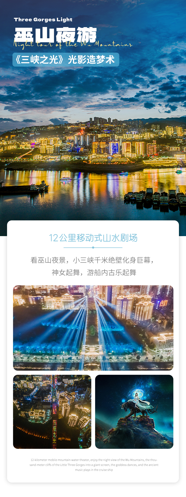 當暮色浸透長江,巫山的燈火便醒了。152棟樓宇沿江而立,20公里岸線鋪開星野,這不是尋常的夜色,而是一場名為《三峽之光》的時空遷徙。兩岸3D影像講述巫山故事,船上也有歌舞表演;