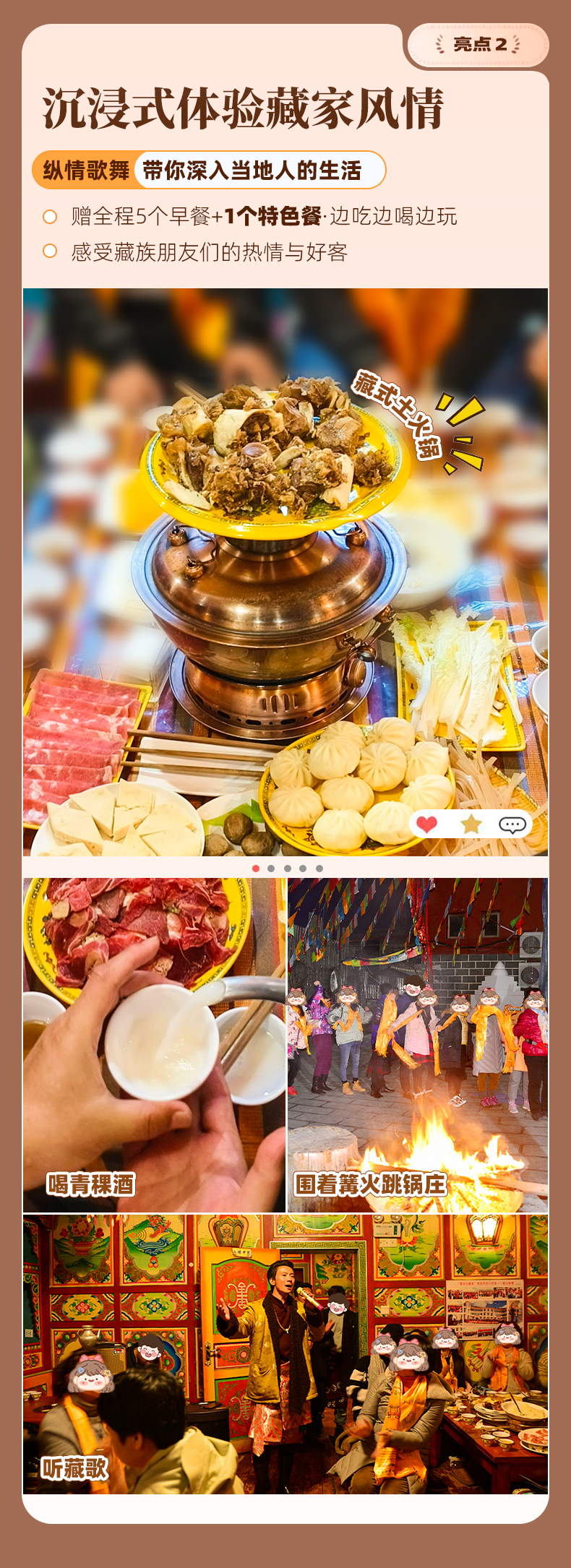 (1)藏式人文體驗(yàn):藏家主人獻(xiàn)哈達(dá)、喝酥油茶、圍著篝火跳鍋莊;