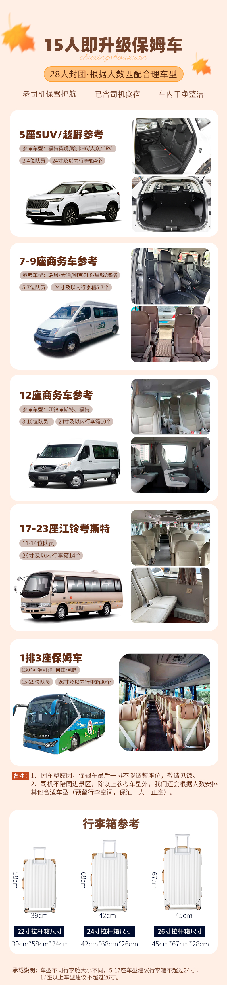 1、交通:根據(jù)人數(shù)確定車輛,15人即升級保姆車(已含駕駛員食宿);