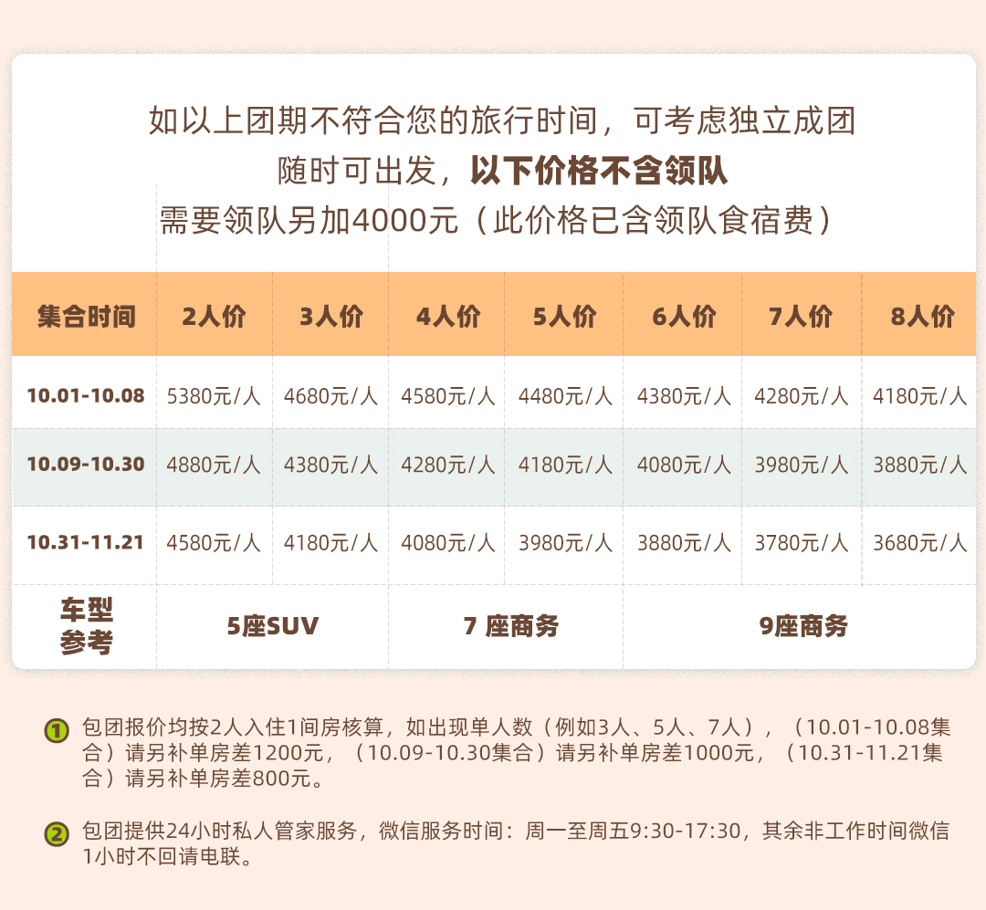 【成團(tuán)說明】1人成行,1-5人司機(jī)兼向?qū)В?人及以上配純玩領(lǐng)隊(duì),15人即升級攝影師+領(lǐng)隊(duì)雙人服務(wù),28人封隊(duì);